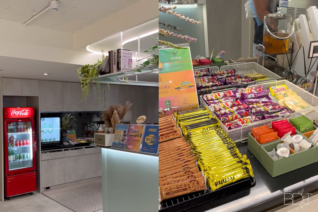 There is a snack bar with FREE biscuits, candies, coffee, and tea.