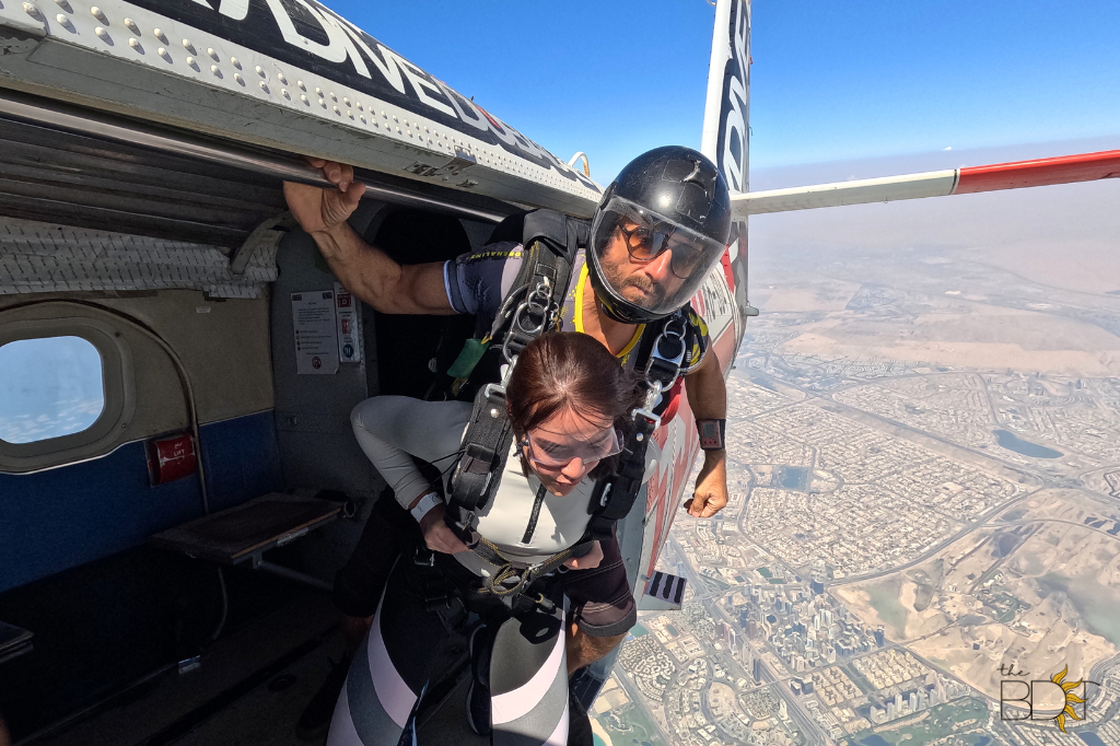 As we were about to reach the correct altitude for jumping out of the plane, I was asked to sit on my instructor’s lap. This was the protocol so he could secure all the connection points between my harness and his. My life would be in his hands for a few minutes after all. Gotta make sure everything’s good! He then gave me goggles and a quick refresher on the whole procedure.