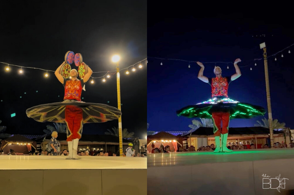 We watched a Tanoura show — a traditional Egyptian folk dance performance where the solo dancer, often donning a colorful skirt (that also lights up!), twirls continuously. Props to that performer because I got dizzy just by watching!